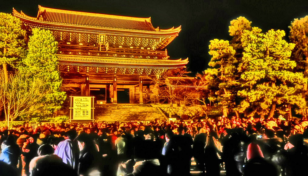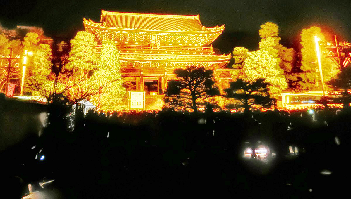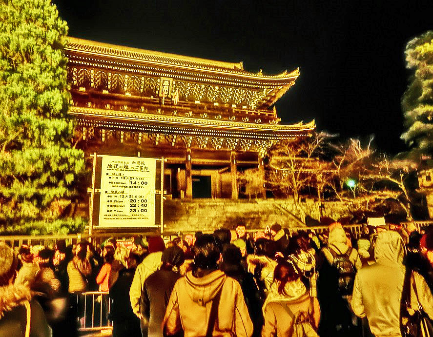 まぶしいライトで黄金に輝く、美しすぎる知恩院を前にして、「おめでとう〜!!」の大歓声の中、めでたく、本年が明けたのでありました・・・