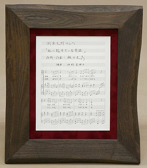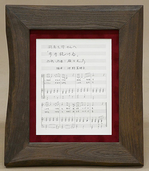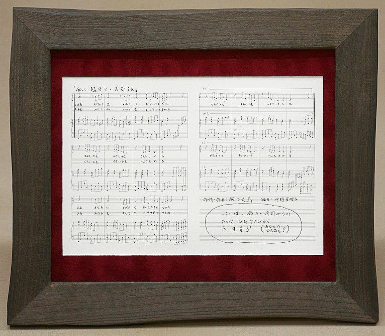 ※ 額縁と楽譜の間には、芸術感覚あふれる高級マット(赤い部分)を使用し、京都を代表する有名な額縁専門店(寺町三条上る)の職人さんにお願いして、熟練の技で組み上げていただきます。(飯田には不可能な技術ですので・・・)