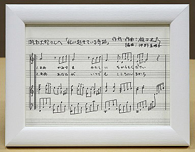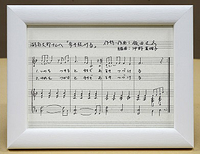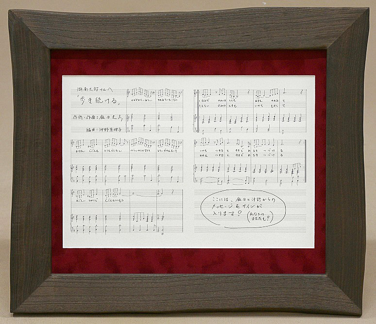 そこで、経営学者でもある私が、あらゆる可能性を検討した結果、「これだ!!」と行き着いたのが・・・「飯田が歌詞を手書きし、沖野さんに音符を手書きしていただいた直筆楽譜を、飾ることのできる芸術作品という形で発表&販売する」、という方法でした。(商品名は、「直筆楽譜芸術」とさせていただきます)