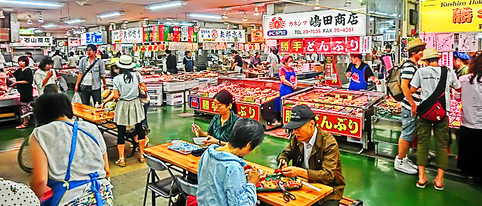 様々なお店を回りながら、食べたいネタ(おかず)を好きなだけ買い、勝手に乗せて食べる、という仕組みです。