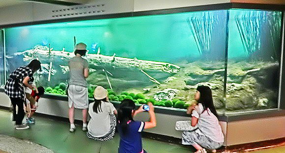 乗客たちは、待ちに待った、「まりも展示観察センター」を見物。
