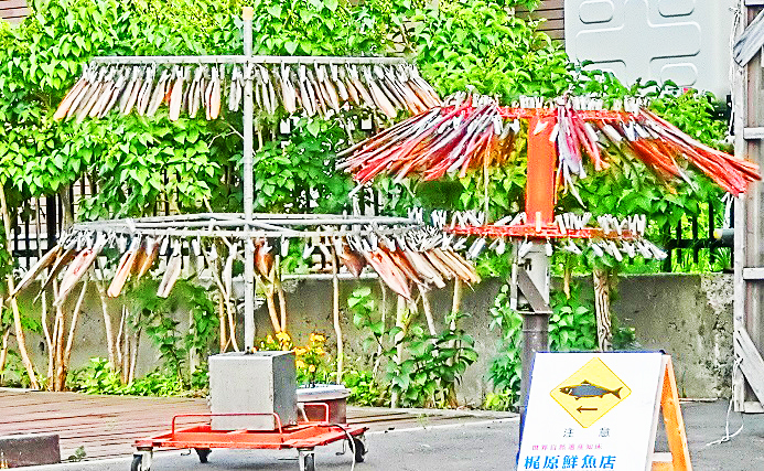 「ウトロ」の街では、魚を吊るして回転させる、「自動天日干し装置」が、あちこちに・・・