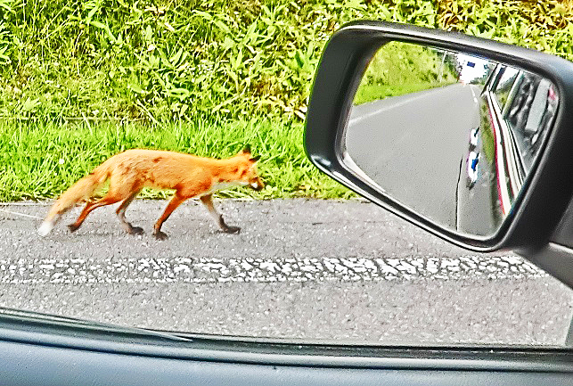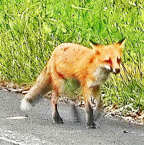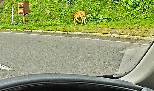 あれ! 野生のシカの子ども(いわゆるバンビちゃん)が、不用意に、道路端にまで出て食事中!