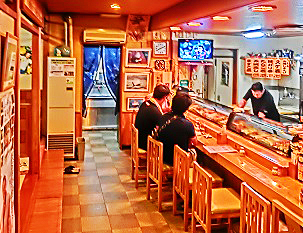 羅臼(らうす)の街に着くと、目立つところで一軒だけ明かりがついていた、お寿司屋さんに入店。