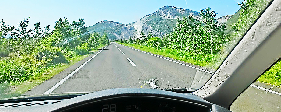 ホテルを早朝にチェックアウトして、眠い目で運転していると、前方に巨大な噴煙が!!