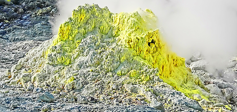 噴煙(蒸気)と共に吹き出した硫黄が、黄色く光っています。