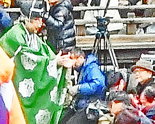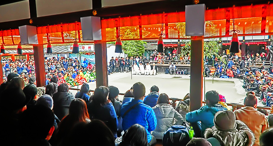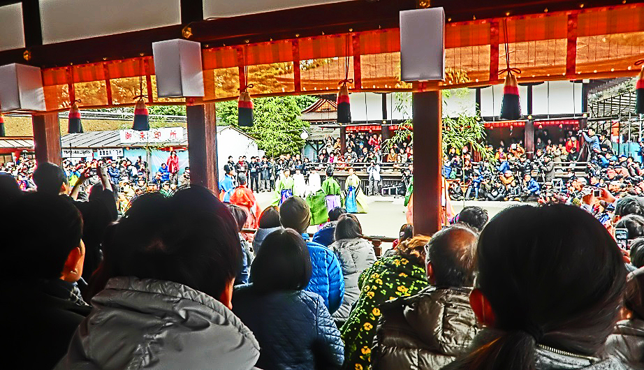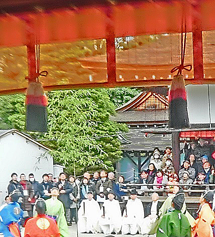 巫女さんのご案内で、特別観覧席(舞台)の上に登ると、