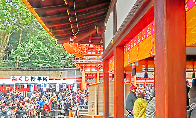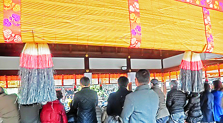本殿前に、横並びに長く広がる「お賽銭箱」の上空には、