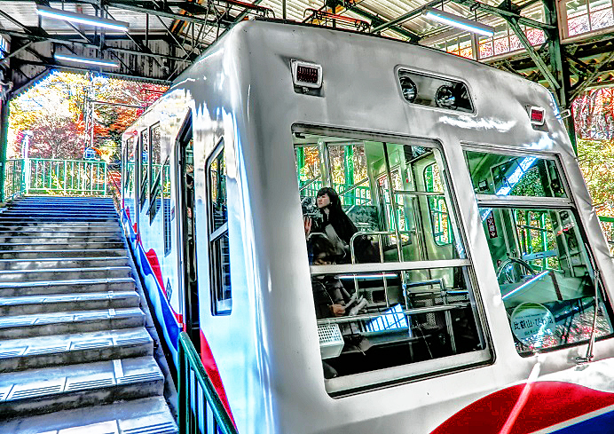 青空のもと、ついに、山頂の駅が、近づいてきましたよ。