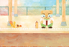 4.ふみクマ先生と一緒に、電車を待っている動物は、何ですか?