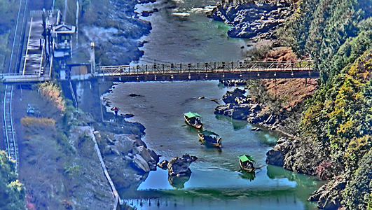 すると、トロッコ列車の駅の真下を、川下りの船が、3つも並んで下流に向かう姿が・・・