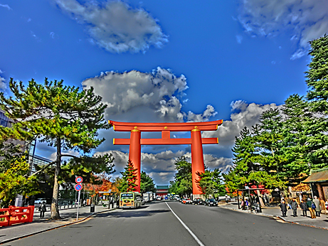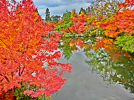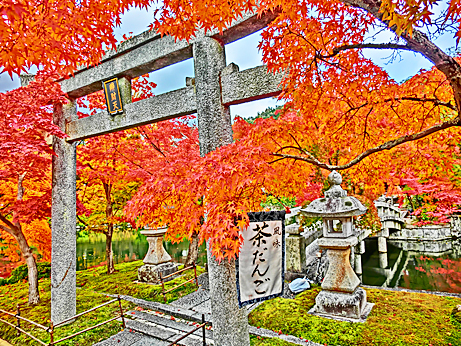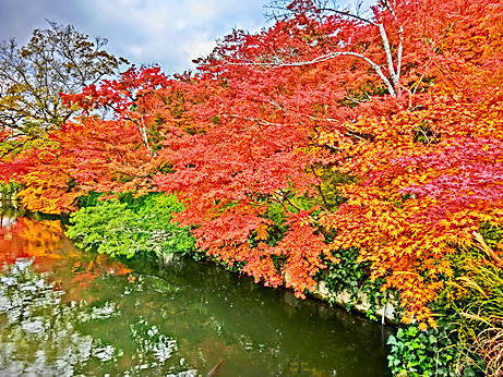 正面に「平安神宮」が見えてきて、近くのお堀には、見事な紅葉並木が現れました。