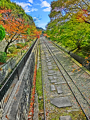 琵琶湖に向かう船を乗せて運び上げた鉄道、「インクライン」の線路跡を横目に見ながら進むと・・・