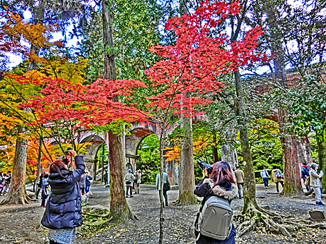 レンガ色と紅葉との見事な相乗効果に、観光客たちが歓声を上げていました。