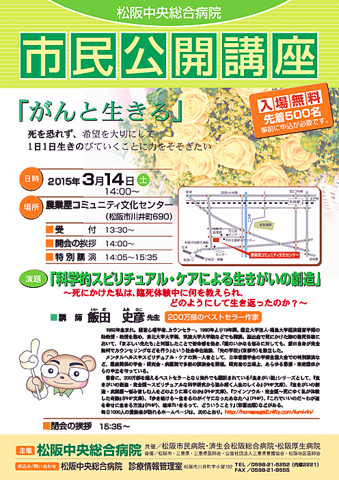 申込方法: 松阪中央総合病院 診療情報管理室(電話0598−21−5252、内線2221)まで、「市民公開講座の申し込みをしたいのですが」と、お電話で告げてください。事前申込が必要であり、先着順でお受けします。