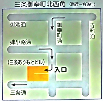 「京都市役所の道向かいにあるコスモ石油の横の道に入る」