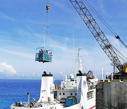 しかし、荒波の断崖に囲まれた南大東島には、船が直接かつ安全に接岸できる港が無いため、上陸するためには、こうして金属のカゴに乗り、クレーンで吊り上げてもらうしかないのだそうですよ!!