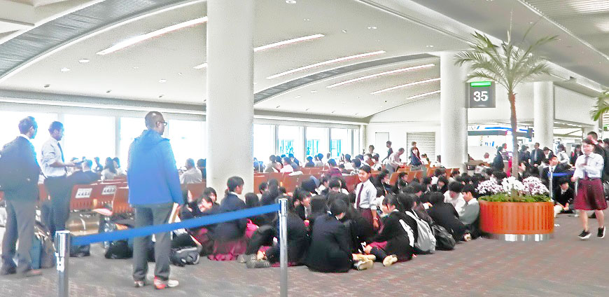 修学旅行生たちが、待合スペースを占拠中・・・修学旅行で沖縄に来るなんて、うらやましすぎる!!