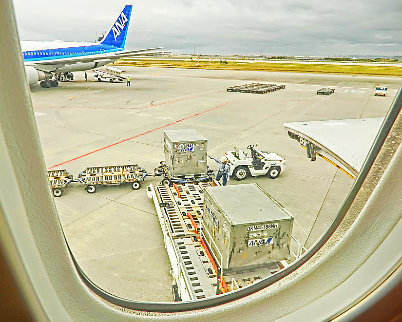 私が預けた荷物が、コンテナに入れられて、機内に積み込まれようとしていますよ。
