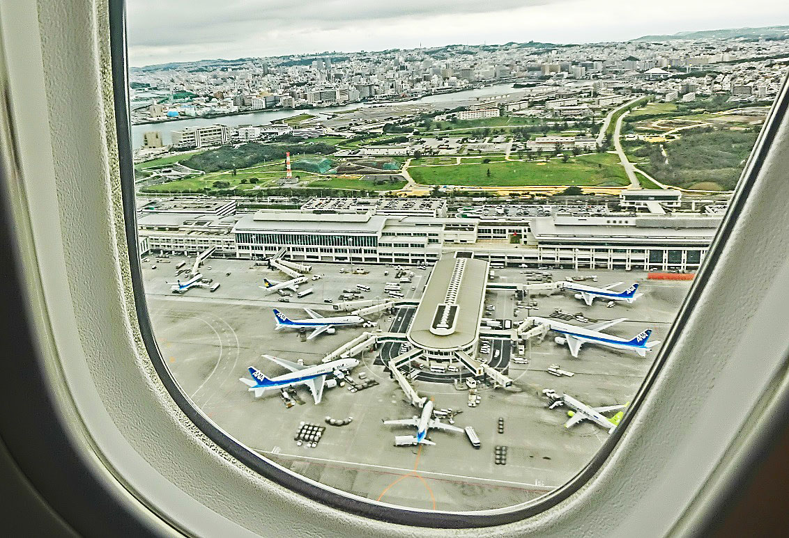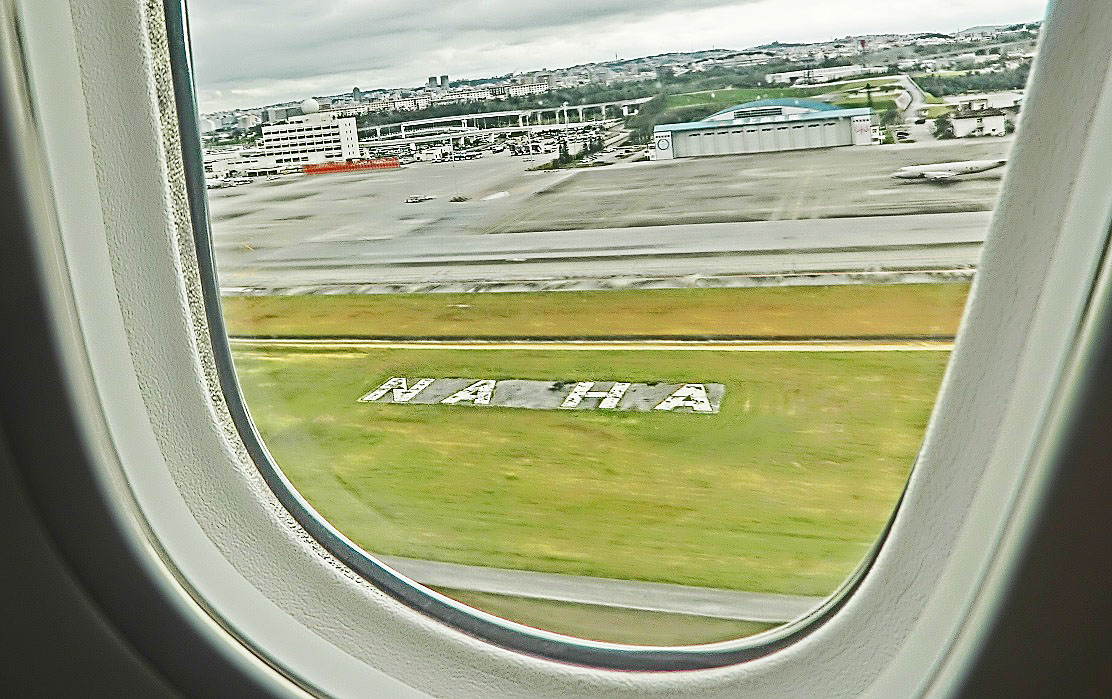 「NAHA」の文字を見下ろしながら、いよいよ、那覇空港に到着。