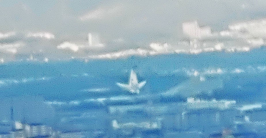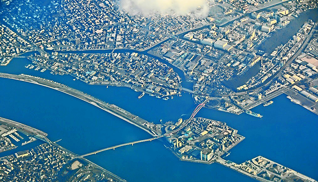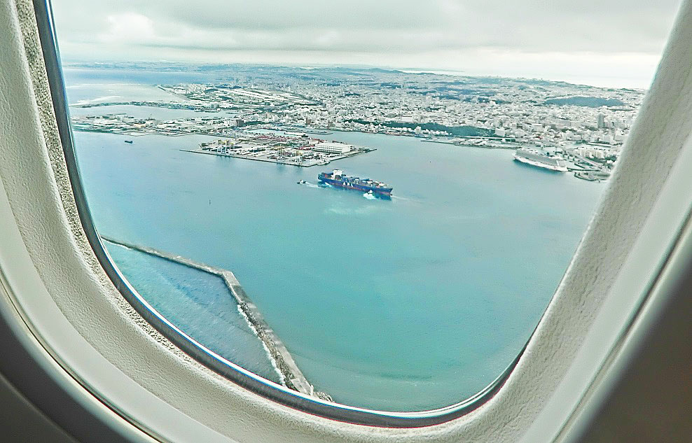その数十秒後には、もう、那覇の港湾地区を、見下ろしていますよ。