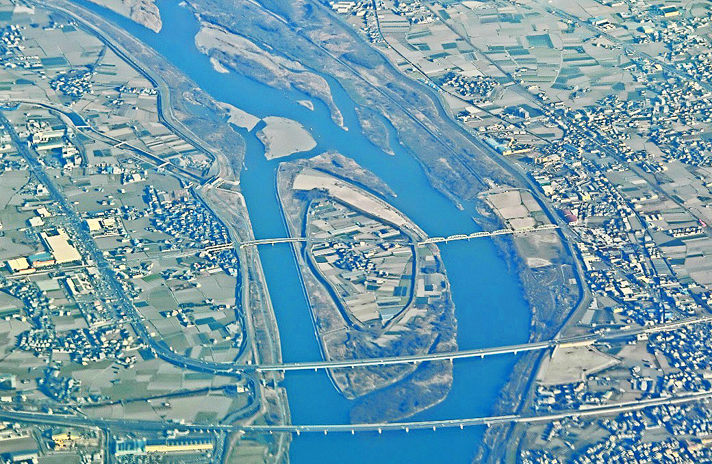 川の中州で、防波堤に囲まれている、城塞のような集落や・・・