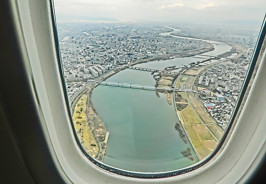 やがて、雲の下に、大阪南部の都市部が見えてくると・・・