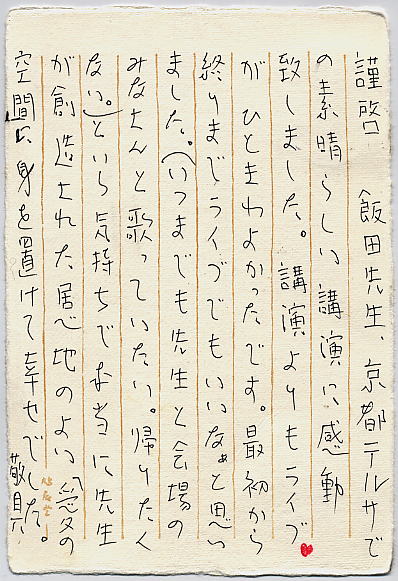 今日の講演会「永遠の愛・めぐり逢う生命」と、宇宙初公開の新曲『ツインソウル』発表会を兼ねたトーク&ライヴは、飯田先生の愛読者にはこれ以上ない最高のファンサービスでした。