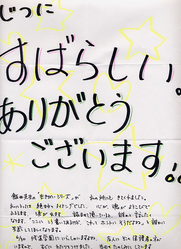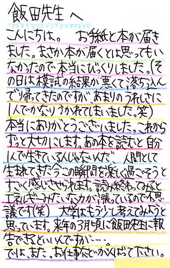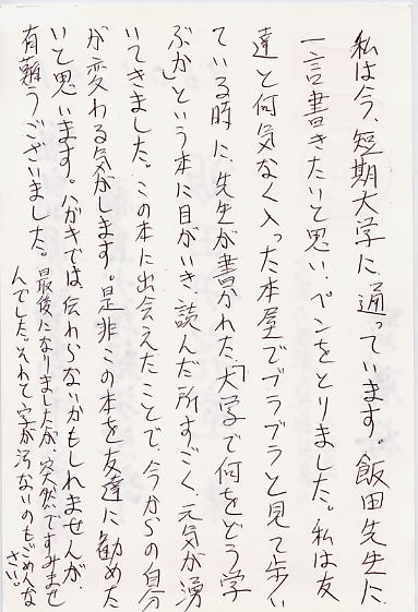 先日、店頭で『生きがいのメッセージ』を見つけ、読み始めたところです。しばらく先生とはご無沙汰しておりますが、先生からのメッセージを本やインターネットを通じて入手できるため、常に先生のそばにいるような気がしています。いつも元気づけていただいて、ありがとうございます。