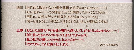 私自身は、本書によって、「自分はプロレスラーとしてデビューしたようなものだ」と、密かに自負しております。なぜなら、本書では、私が三砂教授をゲストに迎えるという立場上、決して私が議論に「勝ってしまう」わけにはいかず、私の「予定通りの負け」が、義務づけられているからです。しかも、女性論と題する本書の中で、私なりのフェミニズム(女性賛美論)を説いている私自身が、目の前にいるカヨワイ女性(三砂教授)をコテンパンにやっつけてしまったのでは、本末転倒というもの。(とはいえ、本気で勝とうと思っても、三砂教授には、やはり勝てないでしょうが・・・涙)