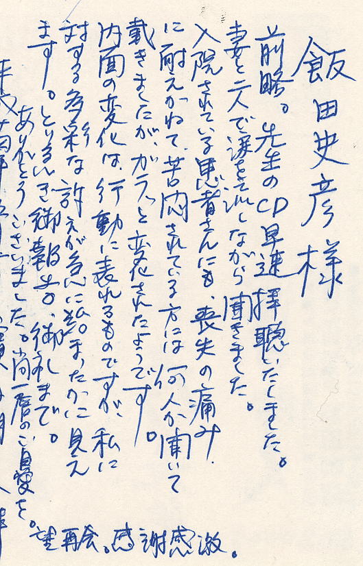特に、「君が背負う すべてのこと 受けとめて 抱きしめるよ」の大合唱のところ。歌の設定としては、男性が愛する女性に向かって語っているところだと思います。しかし、飯田先生が涙を流しながら歌う私達を優しいまなざしでほほえみながら演奏してくださる姿を拝見して、私には「おまえの歌を共に歌ったりする者たちに潜む孤独感を、喜んで、すべて背負うがよい」という光からのメッセージを、今まさに実践してくださっているのだというように思えてなりませんでした・・・・・(感涙)