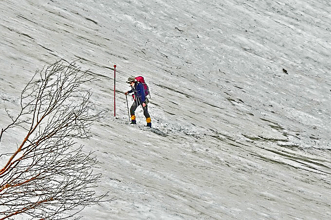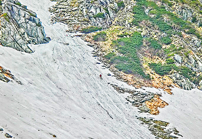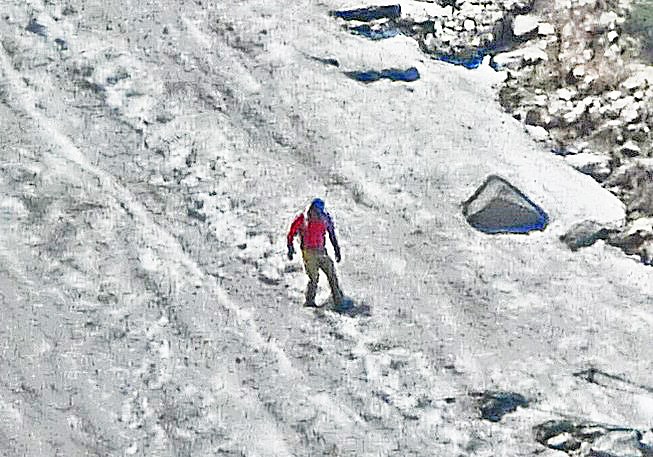 積雪の急斜面において、次の写真の中央でうごめく赤黒い物体を、クローズアップしてみると・・・