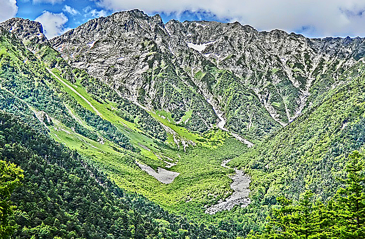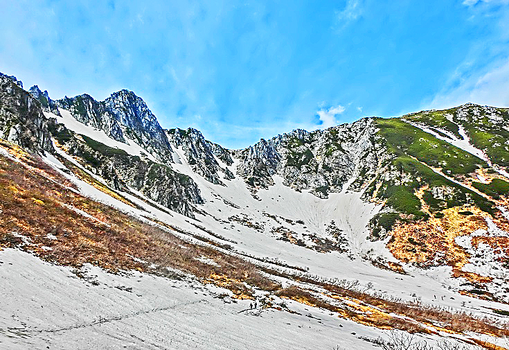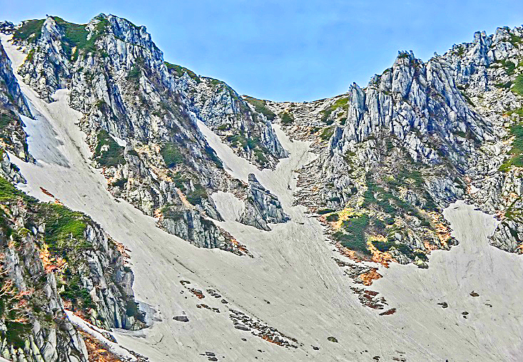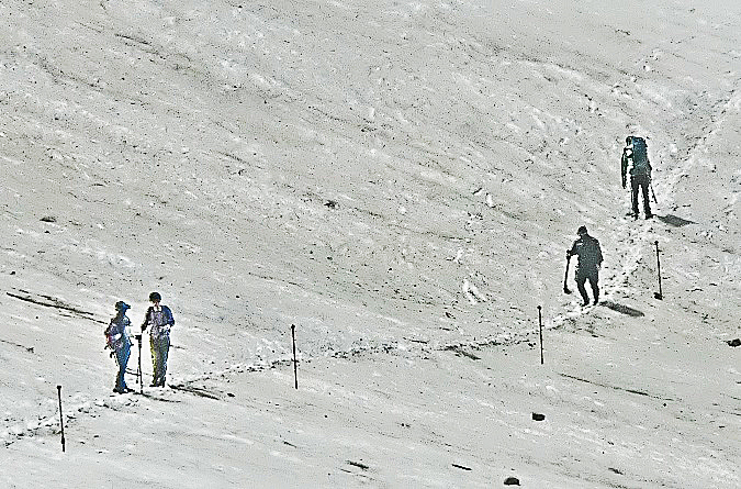 広大な雪渓(せっけい)の下部には、登山者たちが残した、1本の道が・・・