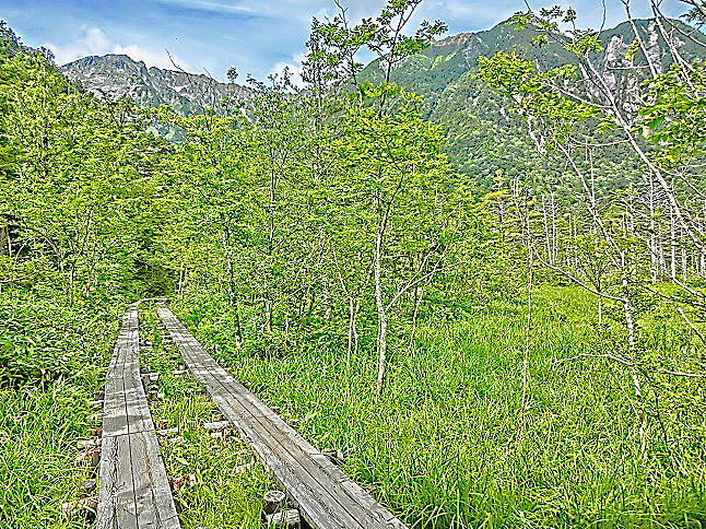 正面の山々を結ぶ尾根には、クネクネした登山道と、登山者さんの雄姿が・・・