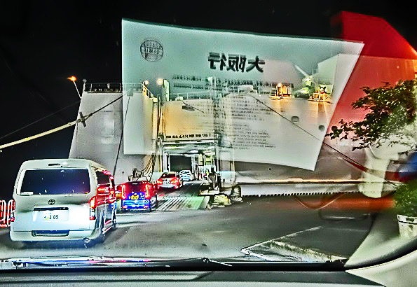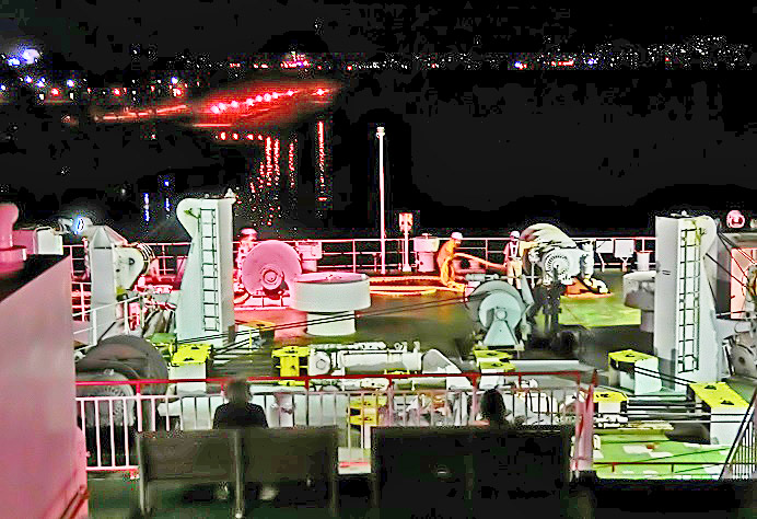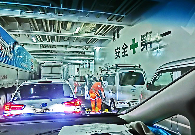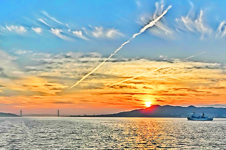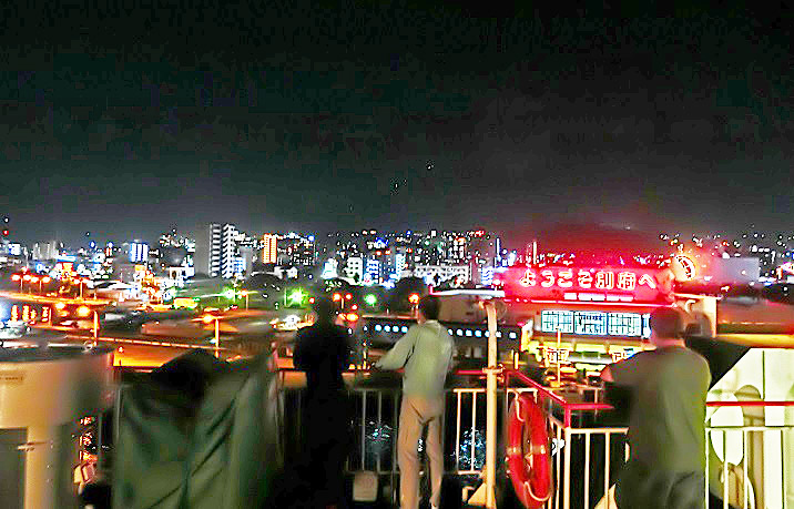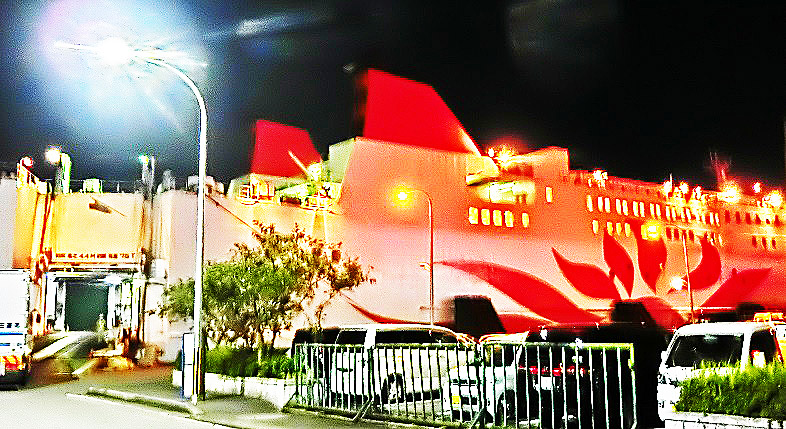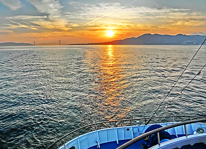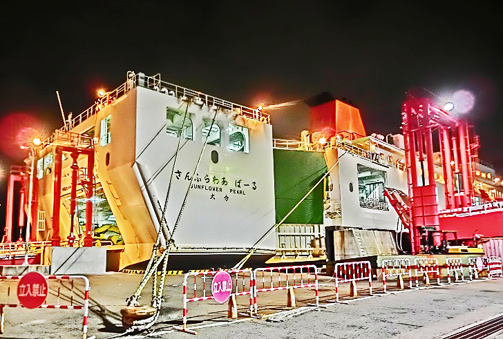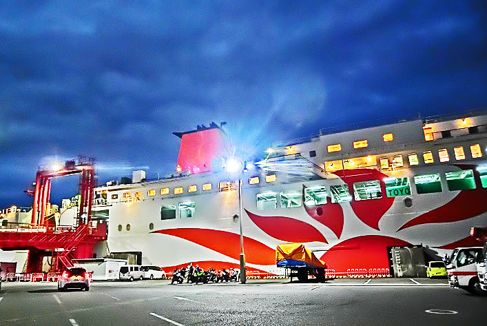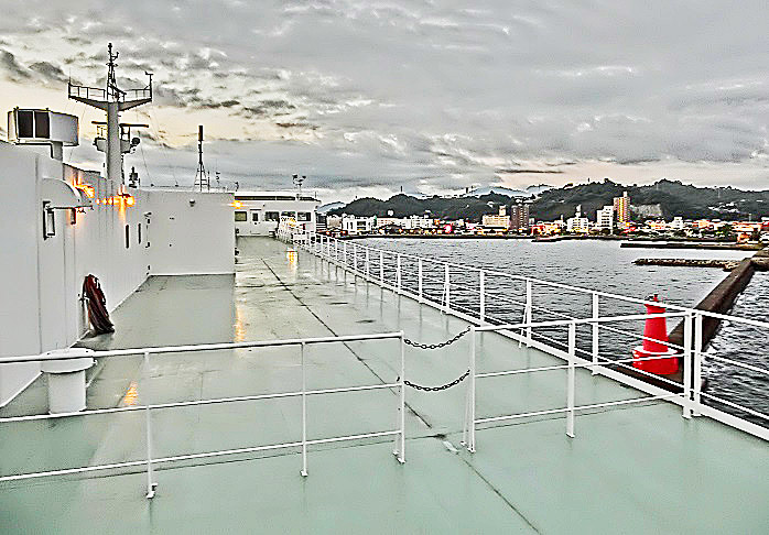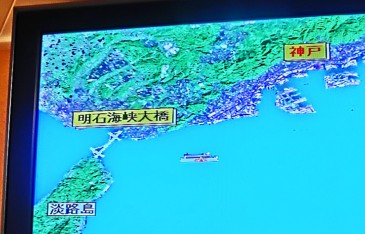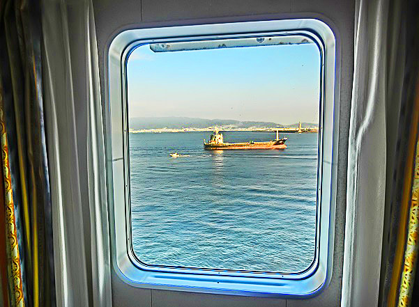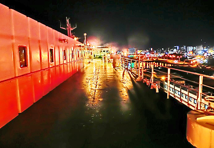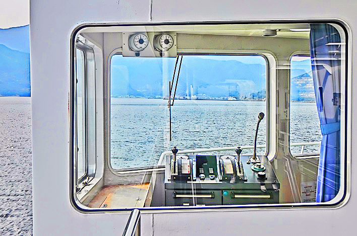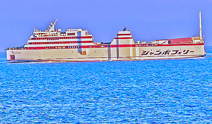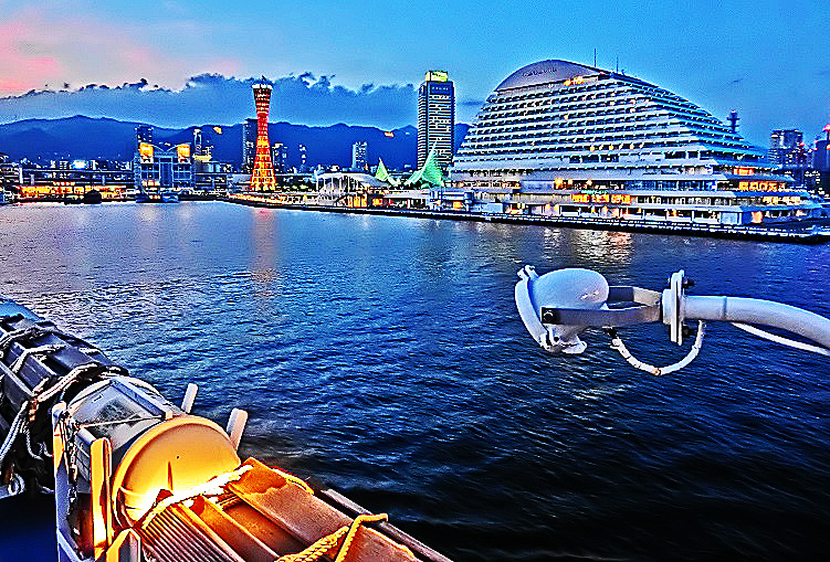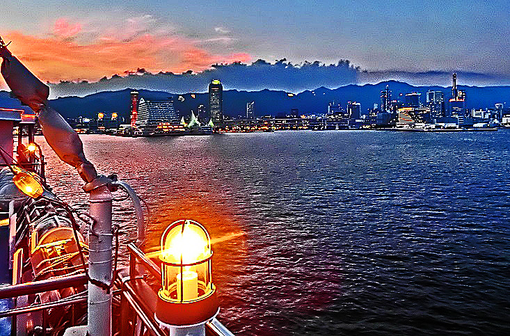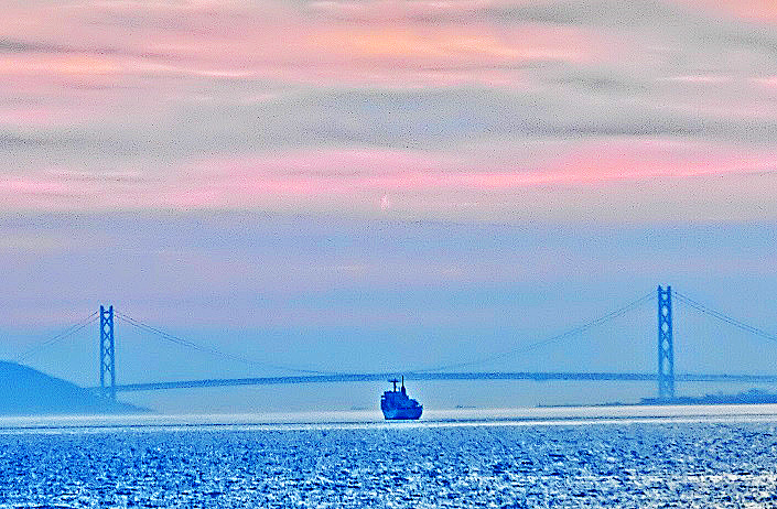 はるか向こうで、巨大なタンカーやマグロ漁船風の船舶たちが、行き交っていますよ。