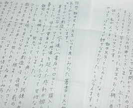 ・・・という2通のお手紙をいただき、いずれも、心のこもった文章を拝読しながら、私の方こそ感謝の気持ちに満たされて、ポロポロと涙がこぼれてしまいました。(私自身が辛い時に読み返せば元気をいただけますので、このHPでご紹介したお手紙をはじめ、嬉しいお言葉は大切に保存してありますよ)