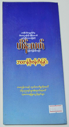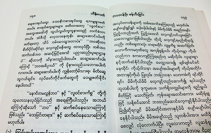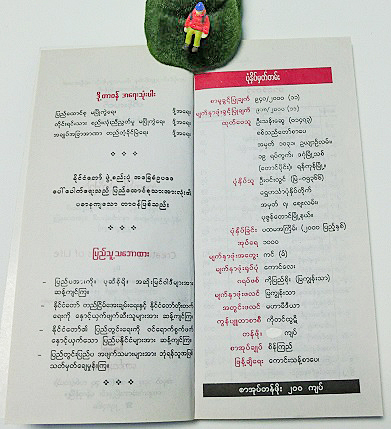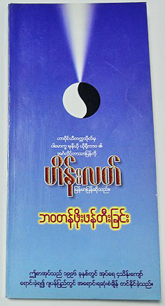 ミャンマーでは細長い本になっており、1枚目の写真が表表紙、2枚目が裏表紙です・・・おそらく、最も大きな文字が書名『生きがいの創造』で、黄色い文字が著者名「飯田史彦」だとは思うのですが・・・