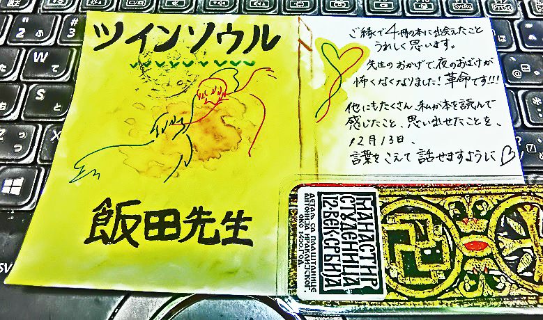 飯田先生の『ツインソウル完全版』の世界観にハマってしまい、どうしても、感想と共にお礼を伝えたく、お手紙いたしました。『ツインソウル完全版』では、「いつか、私もツインソウルに出逢えるかな」という思いや、「もうすでに出逢っている人なのかな」という思いを抱きながら、読み進めていきました。現在は、このようなご時世で、気軽に色々な場所へ飛び回ることができませんが、この本を読んでいる時間は、今いる場所とは違う世界を巡っているようで、とても楽しい時間を過ごすことができました。