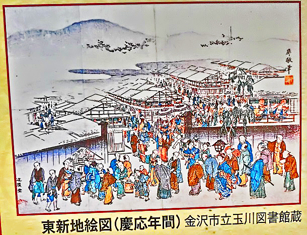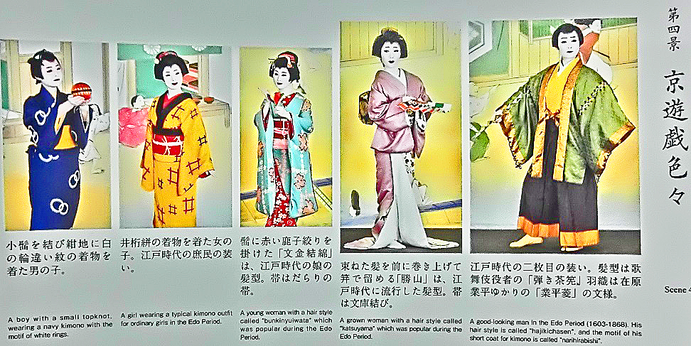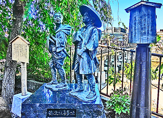 左手で目立っている木像は、大ベストセラーになった紀行文『東海道中膝栗毛』の著者である、十返舎一九さんだそうですよ。ちなみに、「膝栗毛」というのは・・・本当は「栗毛の馬」(栗色の毛を持つ優雅な高級馬)に乗って旅をしたいのだが、そんなお金も身分も持たない庶民の自分は、せめて自分の膝(ひざ)を「栗毛の馬」だと思いながら、自分の足で歩いて旅をするしかないのだ、というジョークとのこと(笑)。