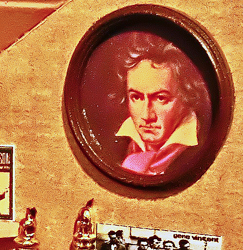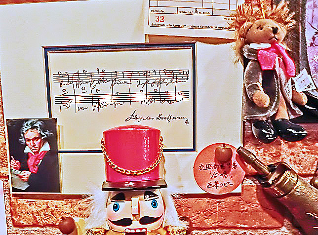 ザルツブルク(オーストリア)のベートーヴェン記念館で私が入手してきた、「歓喜の歌」(第9交響曲)の直筆楽譜コピーを背景にしながら、右上の「ベートーヴェン人形」を誇らしげに紹介する、郷土愛に満ちたオジサン・・・