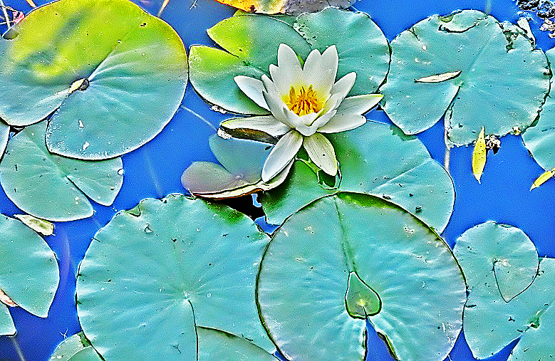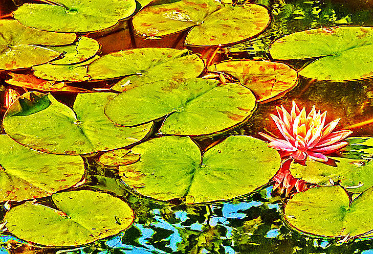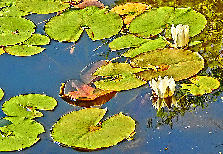 おや? よく見ると、わずかながらも、花が咲いているではありませんか・・・睡蓮の花は、午前中の早い時間帯に咲いて、お昼までにはしぼんでしまうのが通常ですが、中には、のんびりと咲き始めて、仲間たちと一緒にしぼむタイミングを失った、能天気な御方もいらっしゃるご様子ですね(笑)。