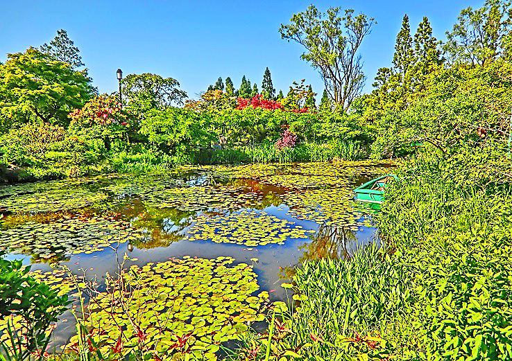 印象派の有名画家:クロード・モネの自宅にあった「睡蓮(すいれん)の池」を、なぜか比叡山の山頂に、高度な造園技術で再現したという、この不思議な光景・・・睡蓮の葉が、いくつもの群れを成しながら、元気いっぱいに広がっていますね。