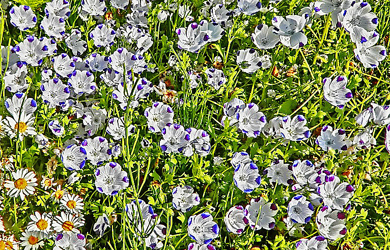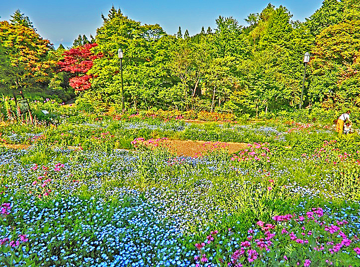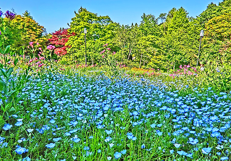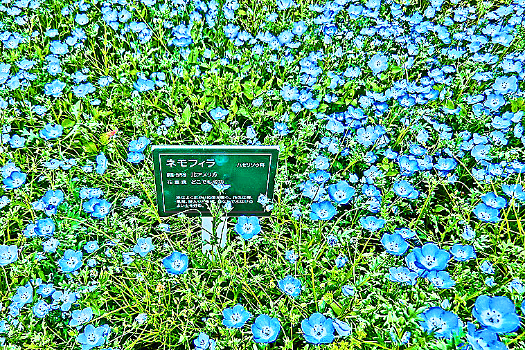 近づいてみると、「ネモフィラ」という花だそうですよ・・・花言葉は「どこでも成功」だそうですから、か弱そうな見た目とは違って、どんな場所にでも生え広がる、強靭(きょうじん)な精神の植物なのでしょうか?(笑)