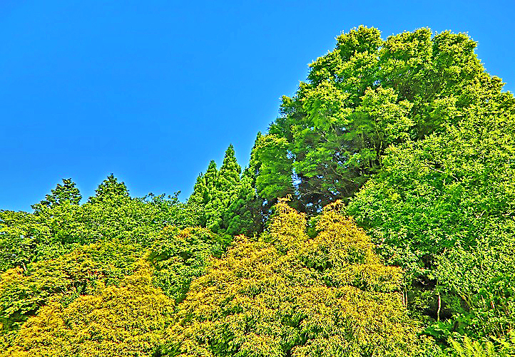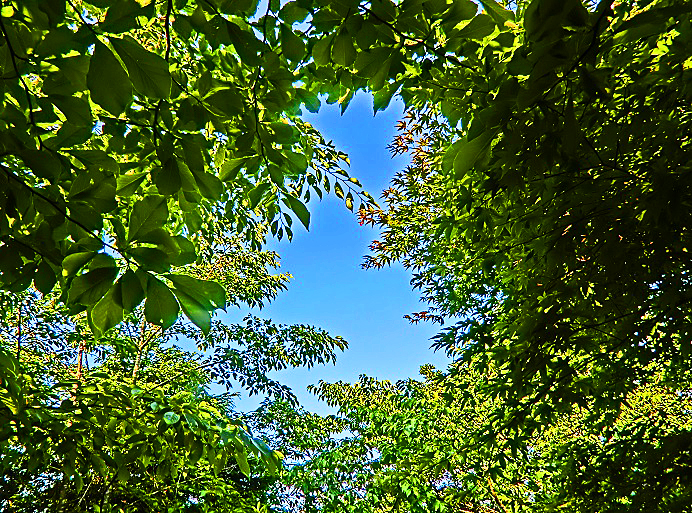 見上げると、清々しい木々の間に、ぽっかりと穴が開いたような、真夏の青空が・・・ちょうど今は、一年間で最も日照時間の長い時期であり、四季の中では、もう「夏」なんですよ。