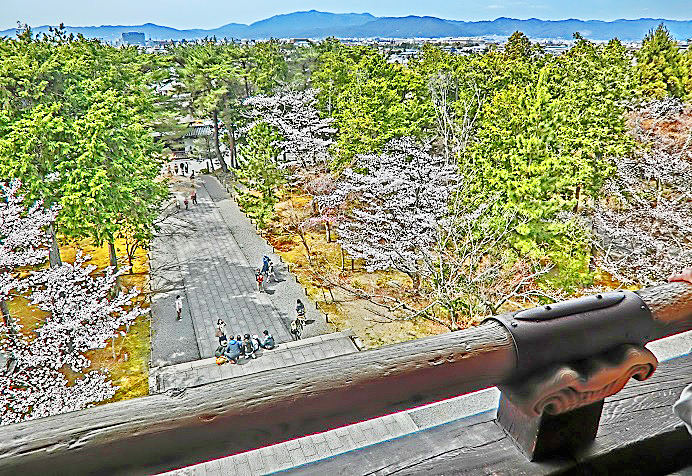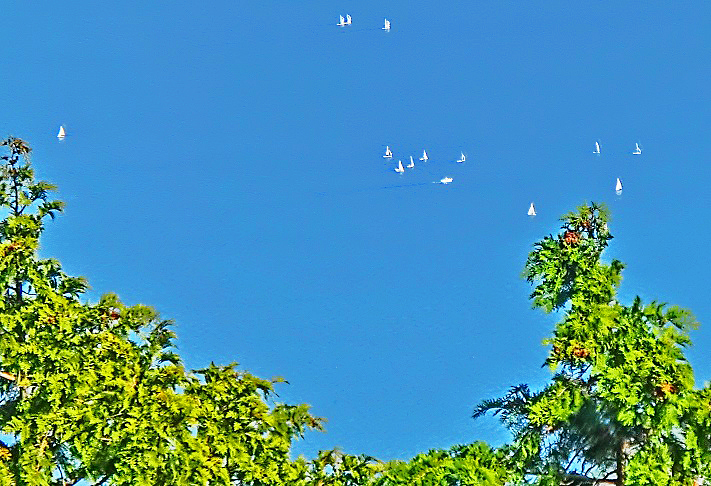 ふと、眼下を見下ろせば・・・下界に広がる琵琶湖(びわこ)の湖面に、数多くの「帆掛け船」(現代風に言えば「ウインドサーフィンのボート」)たちが、うごめいていますよ。海とは違って「波」が襲って来ないので、安全性が高いためでしょうか、琵琶湖は「聖地」として知られているとのこと。