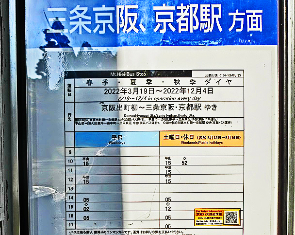 1日に数本ではありますが、なんと、「京都駅」(JR&近鉄&地下鉄)や「三条京阪」(「光の学校」から徒歩10分以内の「三条大橋」東側)からも、路線バスを活用すれば、乗り換え無しで、そのまま一気に山頂まで登って来ることができるのです!!