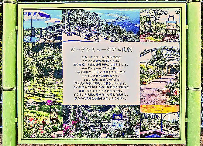 こちらが、比叡山の山頂に、広大な敷地で展開されている、「ガーデンミュージアム」の入口看板・・・紹介文と写真を見るだけでも、楽しそうなムードが伝わってきますよね。