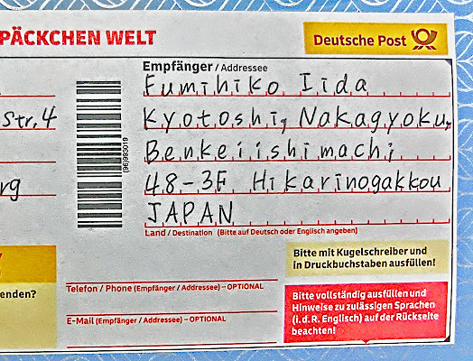 まずは、これが、その国際郵便物に貼られていた、送付先の住所・・・ドイツ語の記述は、さっぱり読めませんが、「Deutsche Post」(ドイツ郵便)という組織(公立なのか民間なのかは不明)が受け取って、日本まで届けてくださったようですよ。
