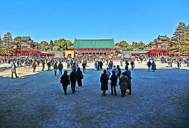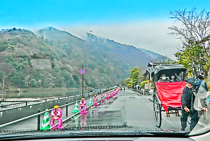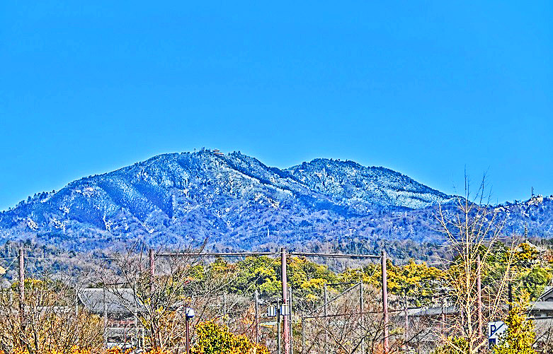 向こうに見えているのは、雪を被った、「比叡山」(ひえいざん)の美景!!