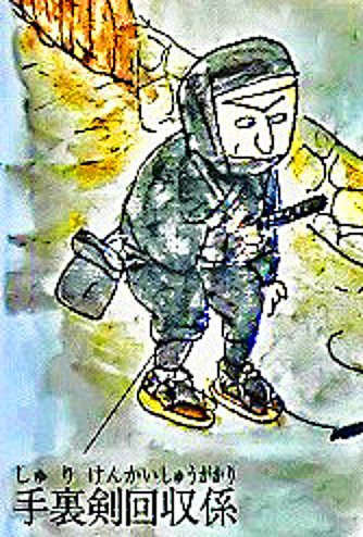 これが、その「手裏剣回収係」・・・敵の目の前まで出て行って、地面に落ちている手裏剣を拾い集めて戻るとは、あまりにも危険な役目(涙)。